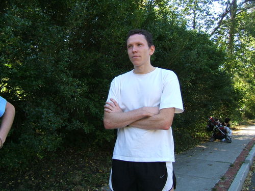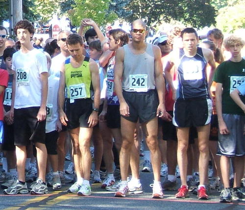 Conor won the race with a time of 33:51, while the second place runner came in around 36:40. So he blew the field away. That’s him at the starting line, in the red racing flats (why not green racing flats?)