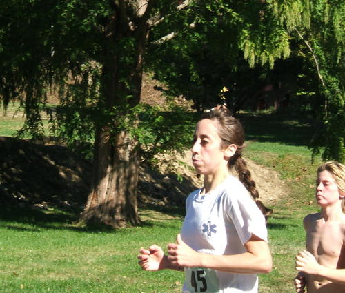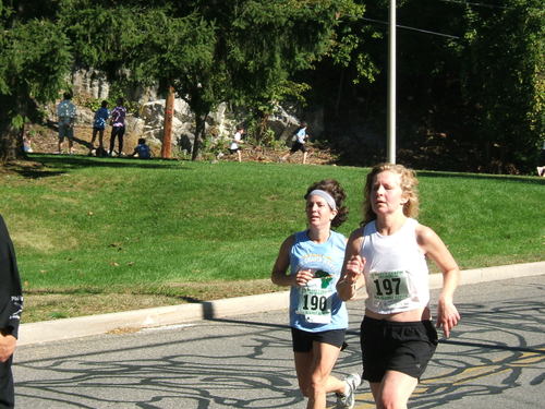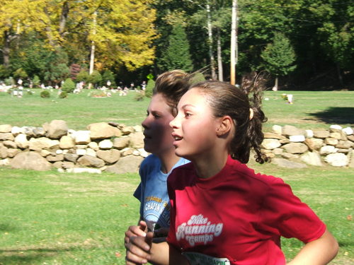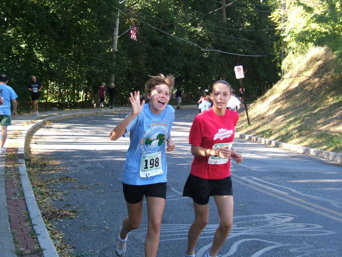 Now the main event is a 10K (6.21 miles), and here are two girls warming up. Kathleen Gagnon, a good friend of ours, waves as she runs with her friend, Caroline Spring.