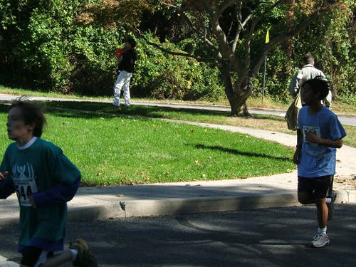 Here’s Joe in the home stretch, as he catches up to and then passes a younger boy. While second in the open division, overall he came about 12th, and was beaten by some fast, younger boys (and one old guy!). But still, he beat a couple of hundred others.