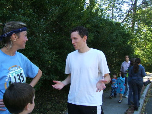 We discussed important issues like the failure of the Irish National Rugby team in the World Cup, and his pending marriage in one week. And I introduced him to a few people who came wandering by – here he is with my neighbor Sue Kane and one of her sons. Sue had run in the race.