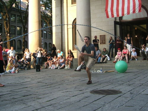 Joe and Tim were with us, and here are some pictures from the rest of our trip. This is Friday, the day we arrived, watching a street performer doing his juggling show in Quincy Market. He told me he’d been juggling for 17 years, since he was ten years old.