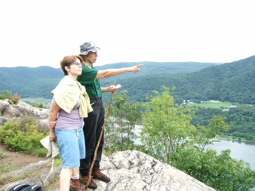There are a few ways to get to the top – straight up from the north side (a bit over a mile walk, but very vertical), or from several locations to the south. We chose to go up from the old Bear Mtn. Bridge toll booth – now a visitor’s center open about three days a week – on the Camp Smith Trail. Total distance is about 4.2 miles.