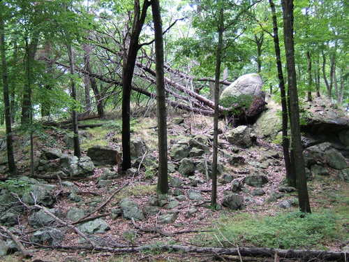 This was a really nice walk, a moderate exertion, but not too tough. HOWEVER, around the two mile mark, where another trail joins in, we did lose track of the trail. We scrambled around for about an hour, keeping roughly a nothwesterly direction, before coming back onto the trail. While we were “a might confused” as Daniel Boone once said, we came across some interesting stuff, including a pond or reservoir that we didn’t know existed. It turns out that we had gone a bit further onto Camp Smith property (a big National Guard area; we could hear gunfire from the distant shooting ranges for much of the time) then was part of the plan. But no harm done.