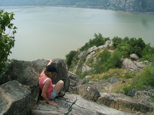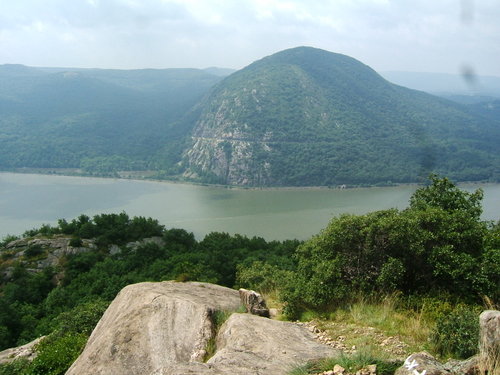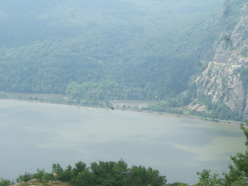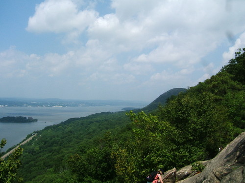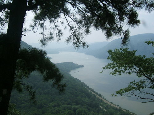 And here’s a view looking north, as we were coming down. On the left you can see Bannerman’s Island, while the hump in the background is Sugarloaf Mountain, which Joe and I climbed a few months ago. Tom Faranda’s Folly: Tom and Joe’s Sunday climb up Sugarloaf In the mist if you use your imagination you can see it – crossing the river further back is the Newburgh-Beacon Bridge.
