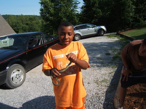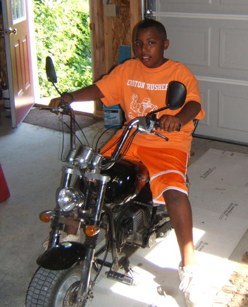 Tim had a great time at Carole and Giles house, as he was able to A) sit on a small Harley and B) play with a snake