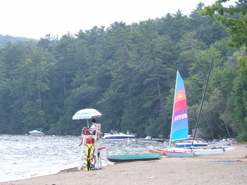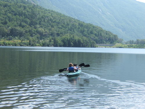 The last full day was Tuesday, and started with swimming and kayaking at Echo Lake – Brigid took this picture. You can see the Notch (in other words, a pass) between the two mountains in the distance, and the small figures barely visible to the left are Tim and I in a kayak.