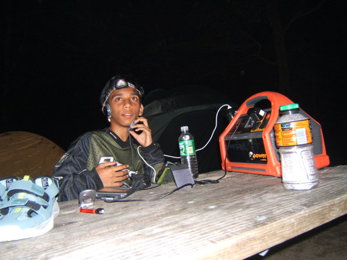 Joe is what you might call a high tech camper. Here he is in the evening with a portable battery that can be used to charge devices, along with his phone, iPod, and headlamp.