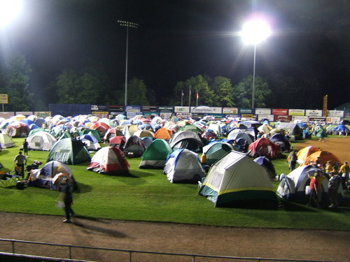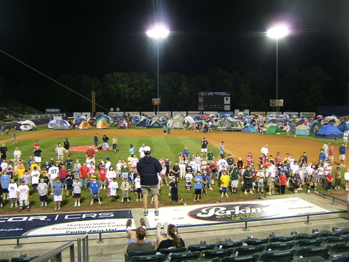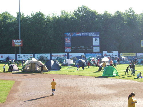 Last night they played the Brooklyn Cyclones, but more importantly, Tim got to horse around with lots of his friends AND then sleep out for the night in the outfield.