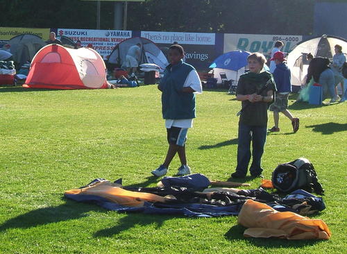 After the game, all the scouts got organized and set up their tents in the outfield. Here is the one we had, a new backpacking tent rather then our standard four person car camping tent. The yellow fly was clipped to the four corners of the base of the tent, but only draped over the inner wall and the two poles, since they didn’t allow staking on the field.