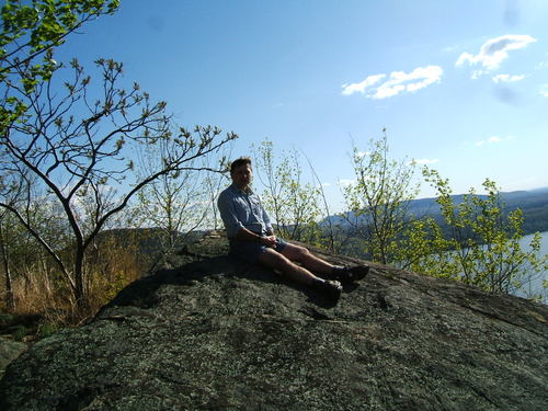 It’s a fairly brisk walk/climb, with some real scrambling the last 80 vertical feet or so. It took us 52 minutes to get to the top, arriving at 5 o’clock. We spent almost an hour at the top, taking pictures, hanging out, and calling Brigid, as well as my college roommate Mike Riner, who lives with his family in Cold Spring.