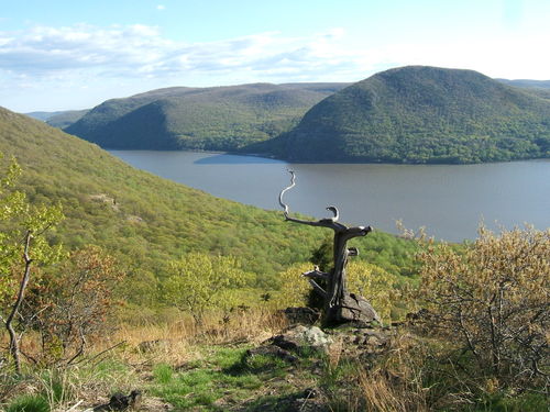Sugarloaf (not to be mis-identified with Sugar Loaf hill, south of Cold Spring) is across and slightly north of Storm King Mountain on the west side of the Hudson. You park just past the tunnel north of Cold Spring, by the railroad tracks paralleling the river, and cross over to the Wilkinson Trail. The trail is yellow blazed and easy to follow.