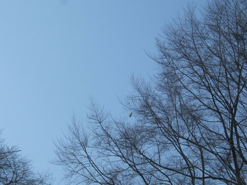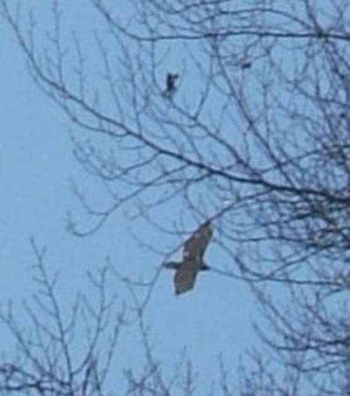 This afternoon I was home for lunch and at 1 o’clock Brigid pointed out two eagles and two hawks (or possible three eagles and a hawk) at about 300 feet, looping around our neighbor’s back yard and also up the street. I grabbed the trusty Fuji E550 and took two shots out the picture window and then went outside and took another picture. The first picture window shot and the outside picture were pretty interesting.