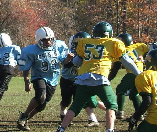 I got to Saturday’s game a little late and the game was already underway. Tim was lined up against an opponent who was bigger then him (taller anyway) and I was thinking “uh oh could be a tough day.” Then on the first play from scrimmage Tim knocked the boy back three yards and pancaked him (knocked him on his backside, for the uninitiated).