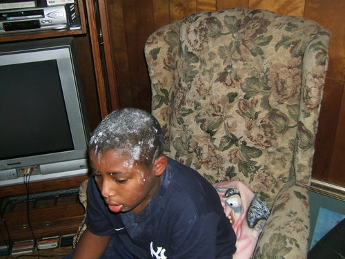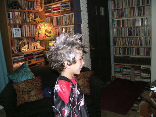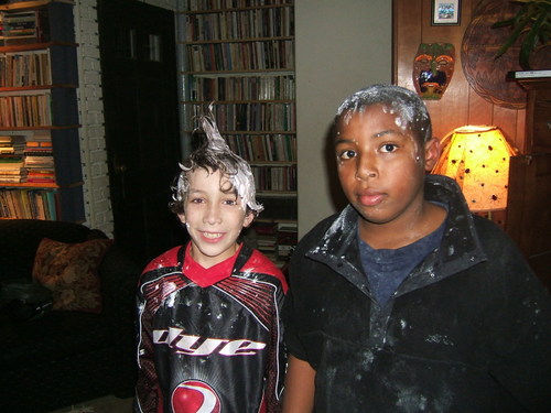 For the first time, our two boys did not go trick or treating for candy, they just went tricking. Brigid helped them out by (against my advice) supplying them with cans of shaving cream. So they took off, each with a friend, to Beekman Ave, where the cool kids hang out.