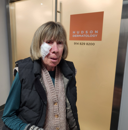 Here we are leaving the dermatology offices in Tarrytown. I guess when they do this job on your face, a plastic surgeon also does some work. I told Brigid that one side of her face will look like she’s 35, so all pictures should be right profile.