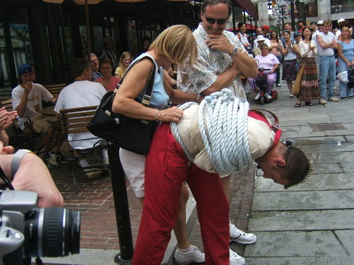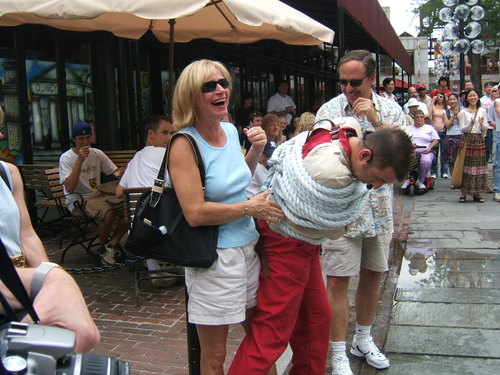 In the Faneuil Hall – Quincy Market area, there were a number of street artists. One of them is an “escape artist” who put himself in a straight jacket and then had two onlookers tie him up. While working his way out of his predicament he spotted Karen Riner and took a liking to her – much to Mike and the crowd’s amusement: