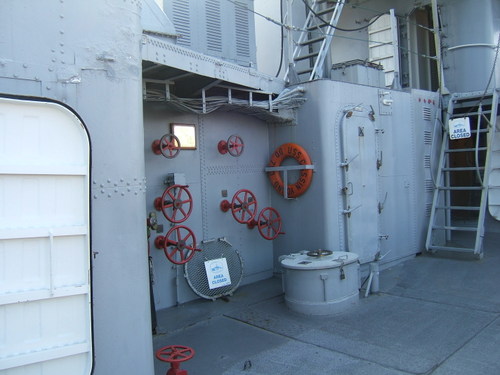 Here’s where the second Kamikaze hit. 22 men were killed and the small plaque is a commemorative. By the way, the ship is named for a naval captain who was killed in a sea battle off Guadalcanal. He had prevously been given the medal of honor for saving his ship – which was tied up next to the Arizona – at Pearl Harbor.
