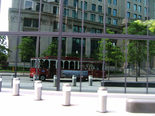 Saturday during the day was spent doing the “Red Trolley” tour, which includes a boat ride into the harbor. Here’s a picture of our Trolley, as it is reflected in the windows of the John Hancock building (the city’s tallest building) in the center of Boston.