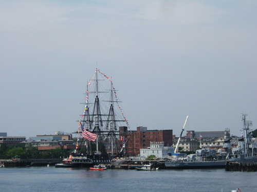 All big city harbors are interesting, and Boston is no exception. Here’s a shot from the tour ferry of “Old Ironsides”, all decked out with pendants. The naval ship to the right is the “Cassin Young” a destroyer from World War II now on permanant exhibit (maintained by the National Park Service!). It survived two kamikaze hits, which killed 23 crew members.