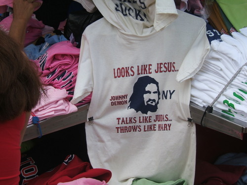 That’s Johnny Damon, as he looked back when he played for the Red Sox. Of course now he’s a clean-shaven Yankee, patrolling center field.