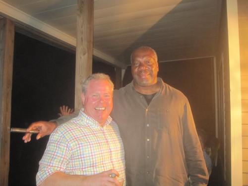 Mike was a super regular guy. And solid. He played football in high school and lifted weights – the parish got him a sub at the local gym. Here he is with ex-NY Giants linebacker Byron Hunt, who played eight years for the Giants in the 1980’s.