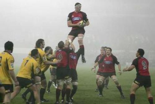 The following picture (note the fog!) shows Chris Jack of Canterbury flying high in a lineout. He gets the elevation by leaping while simultaneously being lifted by teammates. Jack is about 6’6″, so his head has to be about ten feet off the ground.