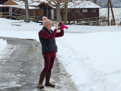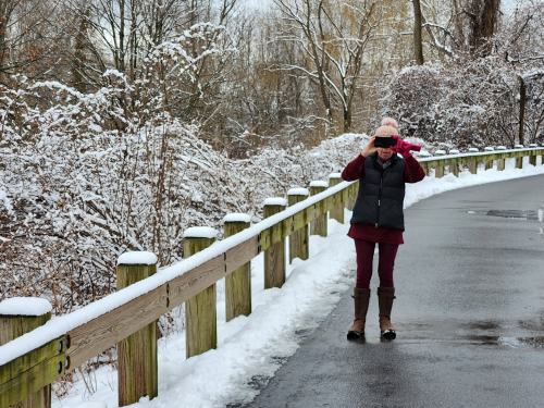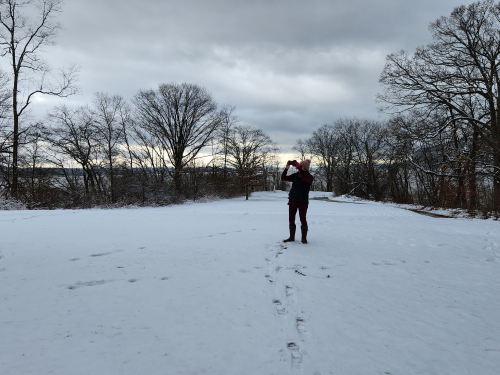 On the walk in, as we take pictures of each other. Nice wintery background.