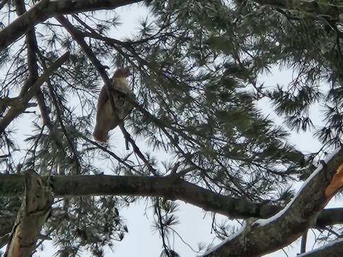 so having turned around and on the way back a red tailed hawk flew above us. And then being tipped off by a woman walking her dog that there was a large owl we went looking. We could hear the owl hotting but no sighting. Then another bird call and we spotted a second red tailed hawk – got some pictures.