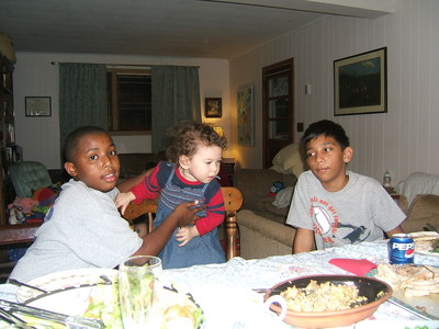Here’s Tim on the left, soon to be nine, and Joe, twelve, with Catherine (turns two in January) in between them, doing her thing. Tim (the football player) is hanging on!