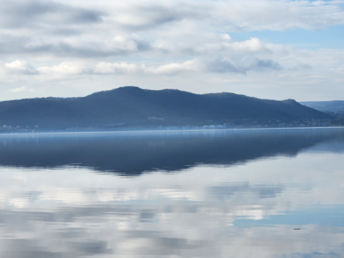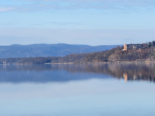 In the afternoon I went on a four and a quarter mile walk, starting at the north end of Half Moon condos, down into Croton Point and back. Took me 81 minutes. The first picture is looking north – you can see Skyview facility. The second across the river – the Sleeping Indian and his reflection!