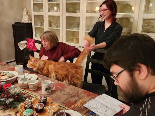 Then to my brother Phil’s house for early evening dessert. So with Allison and and my three nephews – Luke, Greg and Mark – and my only niece Kat. In the foreground is Luke and that’s Kat, Brigid and Atticus the cat. Atticus is HUGE.