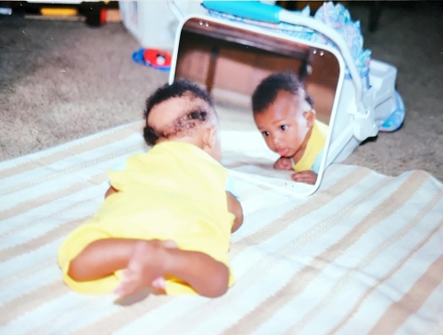 A few months old. HAHAHA! Trying to figure himself out.