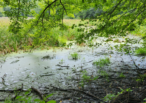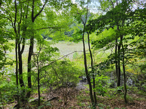 When you get all the way in, there is a pond, and yesterday it looked really scuzzy – the scuzziest I’ve ever seen it. First picture from the trail on the north side of the pond and the second picture from the west end. Doesn’t really do justice to the scuzz.