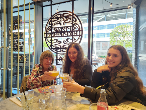 Here Brigid is with the daughters of her niece Rachel – Lizzie and Charlotte – and they are drinking something called a “Porn Star Martini“. Never heard of -I had to look it up, so hit the link. Evidently very popular although as the text says “doesn’t remotely resemble a martini.”
