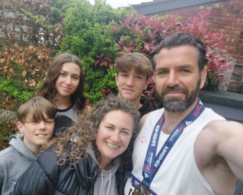 And here’s a picture of nephew Tom this past Saturday with his wife Tamsin and their three children, after he just finished a marathon (time 3:37).