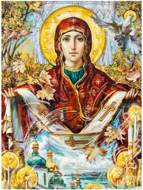 (Icon of Our Lady of Protection by Alexander Ohapkyna, Ukrainian iconographer).