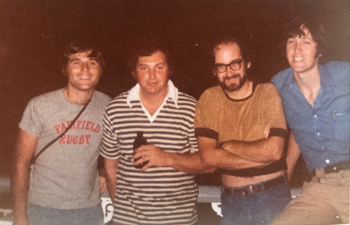 Here is a picture from the end of June, 1979, the night before we flew out of Jamaica. Mick is the guy with the beard, Graham (a rugby player) with a Red Stripe, and tall dude is Liam (another rugby player).