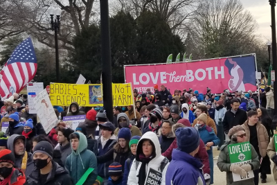 Toward the end of the protest, pro-abortion slogans including “God loves abortion,” and “Abortion forever” were illuminated up on the exterior of the cathedral as demonstrators cheered. On Jan. 20 in Washington, D.C., another activist group, Catholics for Choice, projected pro-choice slogans on the facade of the Basilica of the National Shrine of the Immaculate Conception during a Mass and Holy Hour on the eve of the March for Life.