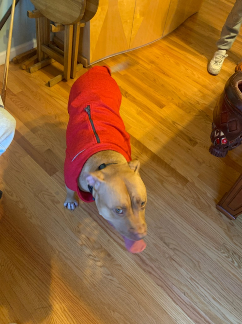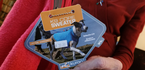 Ultimately Brigid decided to give her new sweater to Stella, Tim’s friend Charlie’s dog. Stella loved it.