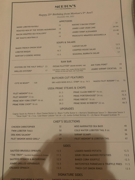 Meanwhile he and his friends were in Manhattan with a bit of a tradition – big, expensive meal on any of their birthdays. Tim texted me the menu.