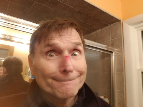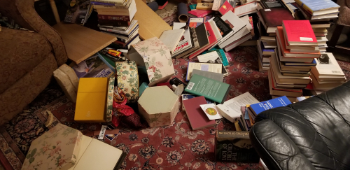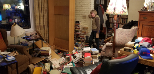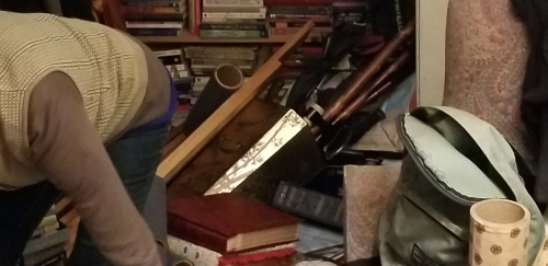 Actually a book case disaster – we were moving the large beige bookcase pictured below (with Tim’s help – we’d taken off the books) when the bookcase went over and the shelves came crashing down. I took a direct shot in the beak from a shelf – lucky it’s just a cut. Tim actually prevented the whole bookcase from landing on me – which would have been awkward. You can see the remnants of the jerry-rigged bookcase that had stood for 30 years against the white wall (it was always an accident waiting to happen anyway) behind the beige bookcase and which also fell. Hundreds of books to clean up and reorganize, and an opportunity to give some of them away – about 35 in two boxes set to go.