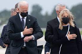This happened multiple times at the solemn transfer ceremony and return of the 13 servicepeople killed a week ago at the Kabul airport. The first picture is the widely distributed photo of him checking his watch. The second picture explains it. Thanks to Linda for sending it to me.